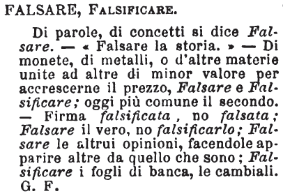 | Falsare, Falsificare - Di parole, di concetti si dice Falsare. - «Falsare la storia.» - Di monete, di metalli, o d'altre materie unite ad altre di minor valore per accrescerne il prezzo, Falsare e Falsificare; oggi più comune il secondo. - Firma falsificata, no falsata; Falsare il vero, no falsificarlo; Falsare le altrui opinioni, facendole apparire altre da quello che sono; Falsificare i fogli di banca, le cambiali. G. F. [immagine] |