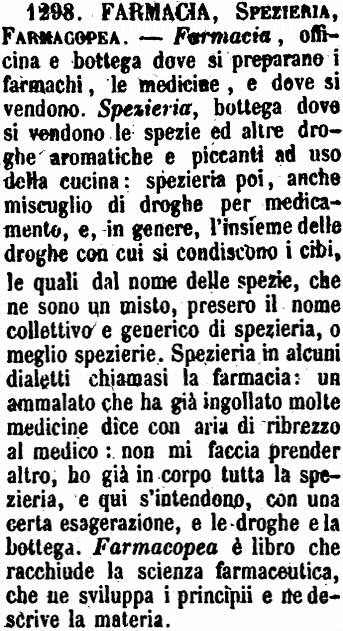 | Farmacia, Spezieria, Farmacopea - Farmacia, officina e bottega dove si preparano i farmachi, le medicine, e dove si vendono. Spezieria, bottega dove si vendono le spezie ed altre droghe aromatiche e piccanti ad uso della cucina: spezieria poi, anche miscuglio di droghe per medicamento, e, in genere, l'insieme delle droghe con cui si condiscono i cibi, le quali dal nome delle spezie, che ne sono un misto, presero il nome collettivo e generico di spezieria, o meglio spezierie. Spezieria in alcuni dialetti chiamasi la farmacia: un ammalato che ha già ingollato molte medicine dice con aria di ribrezzo al medico: non mi faccia prender altro, ho già in corpo tutta la spezieria, e qui s'intendono, con una certa esagerazione, e le droghe e la bottega. Farmacopea è libro che racchiude la scienza farmaceutica, che ne sviluppa i principii e ne descrive la materia. [immagine] |