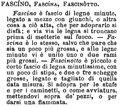 | Fascina, Fastello, Fascinotto; Affastellare, Abborracciare, Acciabattare, Arrocchiare, Abboraccione, Ciabattone, Ciarpone, Arrocchione, Strafalcione - Fascina, fascio di ramoscelli, di legna minuta e di sarmenti legato con giunchi. Fascinotto, piccola fascina già preparata per mettere sul fuoco; può essere legata o no; si fa un fascinotto prendendo uno o due buone manate di ramoscelli, virgulti o sarmenti, rompendoli onde riescano di tale lunghezza da poter capire nel camminetto, e, così accomodato, o si lega per riporre e servirsene all'uopo, o si mette immediatamente nel focolare, il più delle volte per accendere il fuoco o per fare una fiammata. Fastello, piccolo fascio di legna grosse o minute, o d'altro: è termine più generico.
