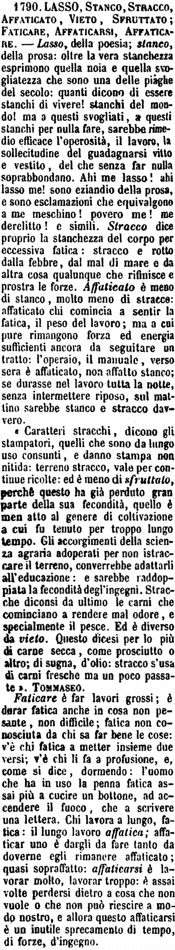 « Caratteri stracchi, dicono gli stampatori, quelli che sono da lungo uso consunti, e danno stampa non nitida: terreno stracco, vale per continue ricolte: ed è meno di sfruttato, perchè questo ha già perduto gran parte della sua fecondità, quello è men atto al genere di coltivazione a cui fu tenuto per troppo lungo tempo. Gli accorgimenti della scienza agraria adoperati per non istraccare il terreno, converrebbe adattarli all'educazione: e sarebbe raddoppiata la fecondità degl'ingegni. Stracche diconsi da ultimo le carni che cominciano a rendere mal odore, e specialmente il pesce. Ed è diverso da vieto. Questo dicesi per lo più di carne secca, come prosciutto o altro; di sugna, d'olio: stracco s'usa di carni fresche ma un poco passate ». Tommaseo. Faticare è far lavori grossi; è durar fatica anche in cosa non pesante, non difficile; fatica non conosciuta da chi sa far bene le cose: v'è chi fatica a metter insieme due versi; v'è chi li fa a profusione, e, come si dice, dormendo: l'uomo che ha in uso la penna fatica assai più a cucire un bottone, ad accendere il fuoco, che a scrivere una lettera. Chi lavora a lungo, fatica: il lungo lavoro affatica; affaticar uno è dargli da fare tanto da doverne egli rimanere affaticato; quasi sopraffatto: affaticarsi è lavorar molto, lavorar troppo: è assai volte perdersi dietro a cosa che non vuole o che non può riescire a modo nostro, e allora questo affaticarsi è un inutile sprecamento di tempo, di forze, d'ingegno. [immagine] |