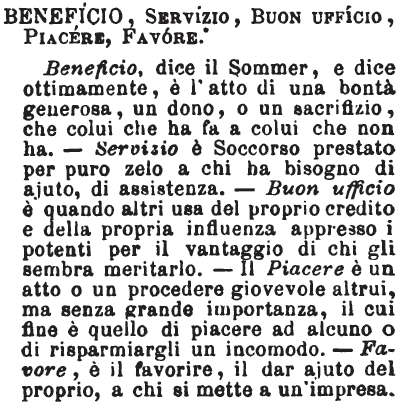 | Beneficio, Servizio, Buon ufficio, Piacere, Favore - Beneficio, dice il Sommer, e dice ottimamente, è l'atto di una bontà generosa, un dono, o un sacrifizio, che colui che ha fa a colui che non ha. - Servizio è Soccorso prestato per puro zelo a chi ha bisogno di ajuto, di assistenza. - Buon ufficio è quando altri usa del proprio credito e della propria influenza appresso i potenti per il vantaggio di chi gli sembra meritarlo. - Il Piacere è un atto o un procedere giovevole altrui, ma senza grande importanza, il cui fine è quello di piacere ad alcuno o di risparmiargli un incomodo. - Favore, è il favorire, il dar ajuto del proprio, a chi si mette a un'impresa. [immagine] |