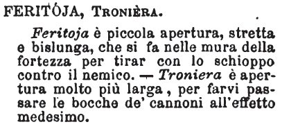 | Feritoja, Troniera - Feritoja è piccola apertura, stretta e bislunga, che si fa nelle mura della fortezza per tirar con lo schioppo contro il nemico. - Troniera è apertura molto più larga, per farvi passare le bocche de' cannoni all'effetto medesimo. [immagine] |
