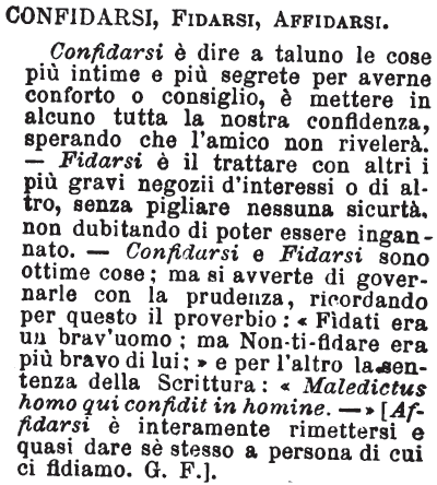 | Confidarsi, Fidarsi, Affidarsi - Confidarsi è dire a taluno le cose più intime e più segrete per averne conforto o consiglio, è mettere in alcuno tutta la nostra confidenza, sperando che l'amico non rivelerà. - Fidarsi è il trattare con altri i più gravi negozii d'interessi o di altro, senza pigliare nessuna sicurtà, non dubitando di poter essere ingannato. - Confidarsi e Fidarsi sono ottime cose; ma si avverte di governarle con la prudenza, ricordando per questo il proverbio: «Fìdati era un brav'uomo; ma Non-ti-fidare era più bravo di lui:» e per l'altro la sentenza della Scrittura: «Maledictus homo qui confidit in homine. - » [Affidarsi è interamente rimettersi e quasi dare sè stesso a persona di cui ci fidiamo. G. F.] [immagine] |