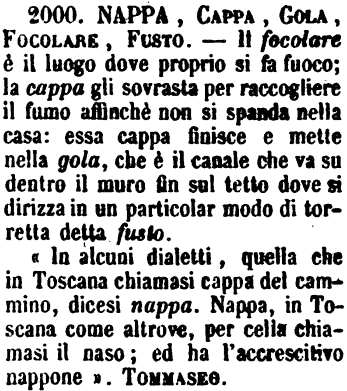 « In alcuni dialetti, quella che in Toscana chiamasi cappa del cammino, dicesi nappa. Nappa, in Toacana come altrove, per celia chiamasi il naso; ed ha l'accrescitivo nappone ». Tommaseo. [immagine] |