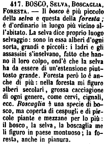 | Bosco, Selva, Boscaglia, Foresta - Il bosco è più piccolo della selva e questa della foresta; è d'ordinario in luogo più vicino all'abitato. La selva dice proprio luogo selvaggio: sono in essa alberi d'ogni sorta, grandi e piccoli: i ladri e gli assassini s'inselvano, fatto che hanno il loro colpo, ond'è che la selva ha da essere di un'estensione piuttosto grande. Foresta però lo è anche di più: nella foresta mi figuro alberi secolari, grossa cacciagione di ogni genere, come cervi, cignali, ecc. Boscaglia è una specie di bosco, ma coperta di cespugli e di piccole piante e mezzane per lo più: il bosco, la selva, la boscaglia me li figuro in paese montuoso; la foresta anche in pianura. [immagine] |