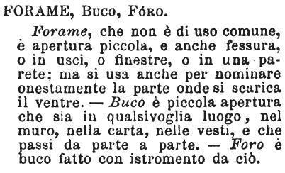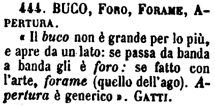 | Buco, Foro, Forame, Apertura - «Il buco non è grande per lo più, e apre da un lato: se passa da banda a banda gli è foro: se fatto con l'arte, forame (quello dell'ago). Apertura è generico». Gatti. [immagine] |