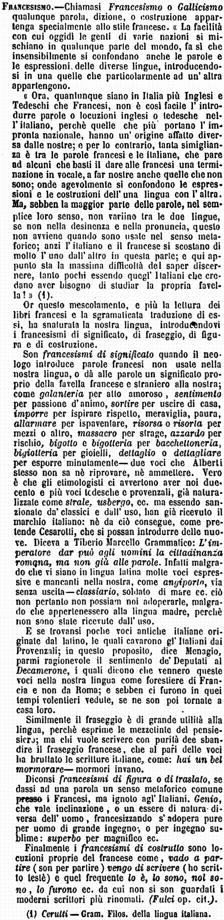 «Ora, quantunque siano in Italia più Inglesi e Tedeschi che Francesi, non è così facile l'introdurre parole o locuzioni inglesi o tedesche nell'italiano, perchè quelle che più portano l'impronta nazionale, hanno un'origine affatto diversa dalle nostre; e per lo contrario, tanta simiglianza è tra le parole francesi e le italiane, che pare ad alcuni che basti il dare alle francesi una terminazione in vocale, a far nostre anche quelle che non sono; onde agevolmente si confondono le espressioni e le costruzioni dell'una lingua con l'altra. Ma, sebben la maggior parte delle parole, nel semplice loro senso, non variino tra le due lingue, se non nella desinenza e nella pronuncia, questo non avviene quando sono usate nel senso metaforico; anzi l'italiano e il francese si scostano di molto l'uno dall'altro in questa parte; e qui appunto sta la massima difficoltà del saper discernere, tanto pochi essendo quegl'Italiani che credano aver bisogno di studiar la propria favella!» (1).