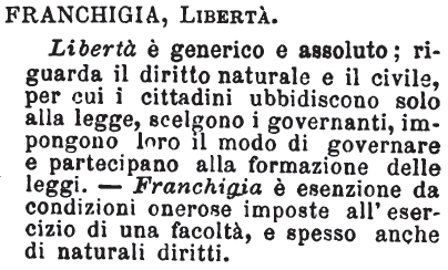 | Franchigia, Libertà - Libertà è generico e assoluto; riguarda il diritto naturale e il civile, per cui i cittadini uddibiscono solo alla legge, scelgono i governanti, impongono loro il modo di governare e partecipano alla formazione delle leggi. -Franchigia è esenzione da condizioni onerose imposte all'esercizio di una facoltà, e spesso anche di naturali diritti. [immagine] |