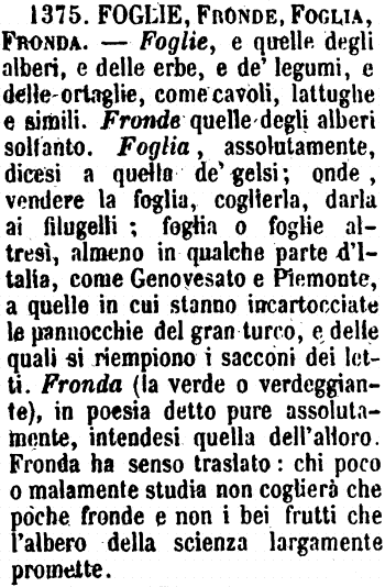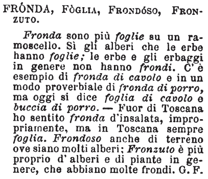 | Fronda, Foglia, Frondoso, Fronzuto - Fronda sono più foglie su un ramoscello. Sì gli alberi che le erbe hanno foglie; le erbe e gli erbaggi in genere non hanno frondi. C'è esempio di fronda di cavolo e in un modo proverbiale di fronda di porro, ma oggi si dice foglia di cavolo e buccia di porro. - Fuor di Toscana ho sentito fronda d'insalata, impropriamente, ma in Toscana sempre foglia. Frondoso anche di terreno ove siano molti alberi; Fronzuto è più proprio d'alberi e di piante in genere, che abbiano molte frondi. G. F. [immagine] |