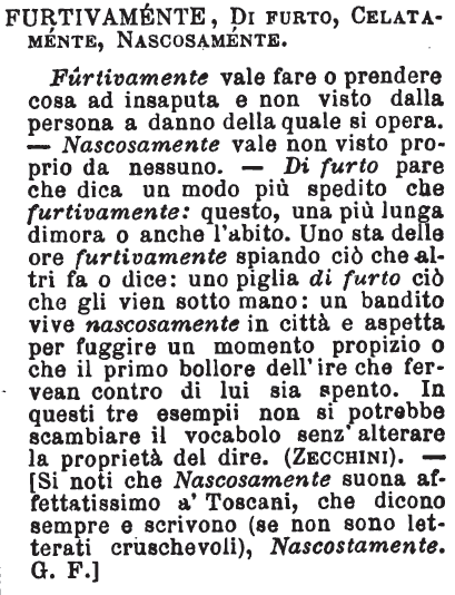 | Furtivamente, Di furto, Celatamente, Nascosamente - Furtivamente vale fare o prendere cosa ad insaputa e non visto dalla persona a danno della quale si opera. - Nascosamente vale non visto proprio da nessuno. - Di furto pare che dica un modo più spedito che furtivamente: questo, una più lunga dimora o anche l'abito. Uno sta delle ore furtivamente spiando ciò che altri fa o dice: uno piglia di furto ciò che gli vien sotto mano: un bandito vive nascosamente in città e aspetta per fuggire un momento propizio o che il primo bollore dell'ire che fervean contro di lui sia spento. In questi tre esempii non si potrebbe scambiare il vocabolo senz'alterare la proprietà del dire. (Zecchini). - [Si noti che Nascosamente suona affettatissimo a' Toscani, che dicono sempre e scrivono (se non sono letterati cruschevoli), Nascostamente. G. F. [immagine] |