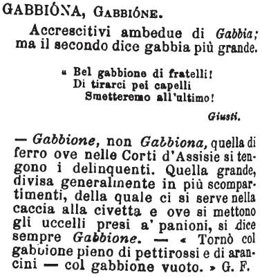 - Gabbione, non Gabbiona, quella di ferro ove nelle Corti d'Assisie si tengono i delinquenti. Quella grande, divisa generalmente in più scompartimenti, della quale ci si serve nella caccia alla civetta e ove si mettono gli uccelli presi a' panioni, si dice sempre Gabbione. - «Tornò col gabbione pieno di pettirossi e di arancini - col gabbione vuoto.» G. F. [immagine] |