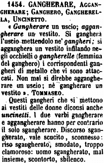 | Gangherare, Aggangherare; Ganghero, Gangherella, Uncinetto - «Gangherare un uscio; aggangherare un vestito. Si gangherà l'uscio mettendolo ne' gangheri; si agganghera un vestito infilando negli occhielli o gangherelle (femmina del ganghero) i corrispondenti gangheri di metallo che vi sono attaccati. Non mai si direbbe aggangherare un uscio; nè gangherare un vestito». Tommaseo.