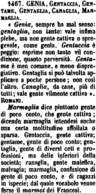 Genia, Gentaccia, Gentame, Gentaglia, Canaglia, Marmaglia - «Genìa, sempre ha mal senso: gentaglia, non tanto: vale infima plebe, ma non gente cattiva o spregevole, come genìa. Gentaccia è peggio: esprime non tanto vil condizione, quanto perversità. Gentame è men comune, e meno dispregiativo. Gentaglia si può talvolta applicare a poche persone; non così l'altro. Canaglia, da cane, più di tutti; vale gente vilmente cattiva». Romani.