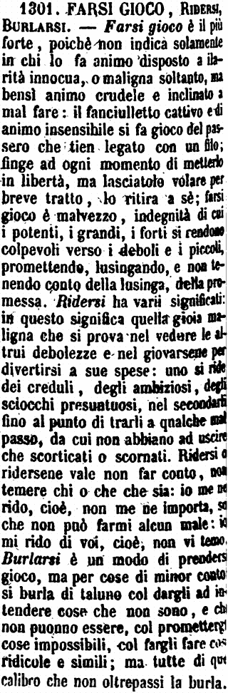 | Farsi gioco, Ridersi, Burlarsi - Farsi gioco è il più forte, poichè non indica solamente in chi lo fa animo disposto a ilarità innocua, o maligna soltanto, ma bensì animo crudele e inclinato a mal fare: il fanciulletto cattivo e di animo insensibile si fa gioco del passero che tien legato con un filo; finge ad ogni momento di metterlo in libertà, ma lasciatolo volare per breve tratto, lo ritira a sè; farsi gioco è malvezzo, indegnità di cui i potenti, i grandi, i forti si rendono colpevoli verso i deboli e i piccoli, promettendo, lusingando, e non tenendo conto della lusinga, della promessa. Ridersi ha varii significati: in questo significa quella gioia maligna che si prova nel vedere le altrui debolezze e nel giovarsene per divertirsi a sue spese: uno si ride dei creduli, degli ambiziosi, degli sciocchi presuntuosi, nel secondarli fino al punto di trarli a qualche mal passo, da cui non abbiano ad uscire che scorticati o scornati. Ridersi o ridersene vale non far conto, non temere chi o che che sia: io me ne rido, cioè, non me ne importa, so che non può farmi alcun male: io mi rido di voi, cioè, non vi temo. Burlarsi è un modo di prendersi gioco, ma per cose di minor conto si burla di taluno col dargli ad intendere cose che non sono, e che non puonno essere, col promettergli cose impossibili, col fargli fare cose ridicole e simili; ma tutte di quel calibro che non oltrepassi la burla. [immagine] |