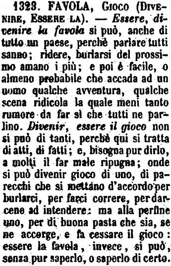 | Favola, Gioco (Divenire, Essere la) - Essere, divenire la favola si può, anche di tutto un paese, perchè parlare tutti sanno; ridere, burlarsi del prossimo amano i più; e poi è facile, o almeno probabile che accada ad un uomo qualche avventura, qualche scena ridicola la quale meni tanto rumore da far sì che tutti ne parlino. Divenir, essere il gioco non si può di tanti, perchè qui si tratta di atti, di fatti; e, bisogna pur dirlo, a molti il far male ripugna; onde si può divenir gioco di uno, di parecchi che si mettano d'accordo per burlarci, per farci correre, per darcene ad intendere: ma alla perfine uno, per di buona pasta che sia, se ne accorge, e fa cessare il gioco: essere la favola, invece, si può, senza pur saperlo, o saperlo di certo. [immagine] |