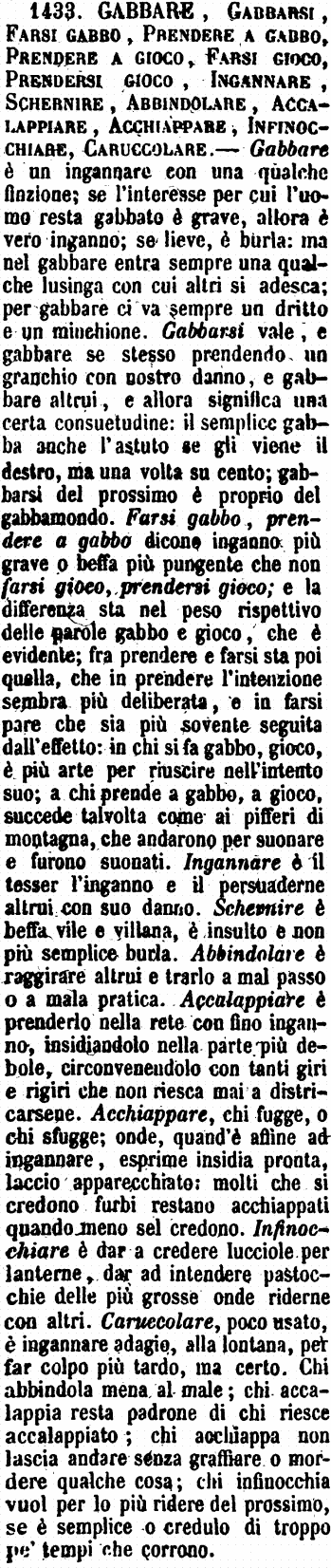 | Gabbare, Gabbarsi, Farsi gabbo, Prendere a Gabbo, Prendere a gioco, Farsi gioco, Prendersi gioco, Ingannare, Schernire, Abbindolare, Accalappiare, Acchiappare, Infinocchiare, Caruccolare - Gabbare è un ingannare con una qualche finzione; se l'interesse per cui l'uomo resta gabbato è grave, allora è vero inganno; se lieve, è burla: ma nel gabbare entra sempre una qualche lusinga con cui altri si adesca; per gabbare ci va sempre un dritto e un minchione. Gabbarsi vale, e gabbare se stesso prendendo un granchio con nostro danno, e gabbare altrui, e allora significa una certa consuetudine: il semplice gabba anche l'astuto se gli viene il destro, ma una volta su cento; gabbarsi del prossimo è proprio del gabbamondo. Farsi gabbo, prendere a gabbo dicono inganno più grave o beffa più pungente che non farsi gioco, prendersi gioco; e la differenza sta nel peso rispettivo delle parole gabbo e gioco, che è evidente; fra prendere e farsi sta poi quella, che in prendere l'intenzione sembra più deliberata, e in farsi pare che sia più sovente seguita dall'effetto: in chi si fa gabbo, gioco, è più arte per riuscire nell'intento suo; a chi prende a gabbo, a gioco, succede talvolta come ai pifferi di montagna, che andarono per suonare e furono suonati. Ingannare è il tesser l'inganno e il persuaderne altrui con suo danno. Schernire è beffa vile e villana, è insulto e non più semplice burla. Abbindolare è raggirare altrui e trarlo a mal passo o a mala pratica. Accalappiare è prenderlo nella rete con fino inganno, insidiandolo nella parte più debole, circonvenendolo con tanti giri e rigiri che non riesca mai a districarsene. Acchiappare, chi fugge, o chi sfugge; onde, quand'è affine ad ingannare, esprime insidia pronta, laccio apparecchiato: molti che si credono furbi restano acchiappati quando meno sel credono. Infinocchiare è dar a credere lucciole per lanterne, dar ad intendere pastocchie delle più grosse onde riderne con altri. Caruccolare, poco usato, è ingannare adagio, alla lontana, per far colpo più tardo, ma certo. Chi abbindola mena al male; chi accalappia resta padrone di chi riesce accalappiato; chi acchiappa non lascia andare senza graffiare o mordere qualche cosa; chi infinocchia vuol per lo più ridere del prossimo, se è semplice o credulo di troppo pe' tempi che corrono. [immagine] |