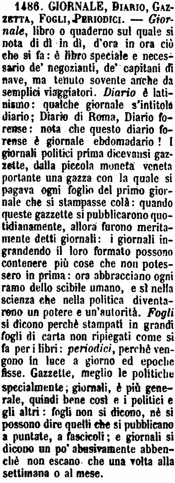 | Giornale, Diario, Gazzetta, Fogli, Periodici - Giornale, libro o quaderno sul quale si nota di dì in dì, d'ora in ora, ciò che si fa: è libro speciale e necessario de' negozianti, de' capitani di nave, ma tenuto sovente anche da semplici viaggiatori. - Diario è latinismo: qualche giornale s'intitola Diario: Diario di Roma, Diario forense: nota che questo Diario forense è Giornale ebdomadario ! - I giornali politici prima dicevansi Gazzette, dalla piccola moneta veneta portante una gazza, con la quale si pagava ogni foglio del primo giornale che si stampasse colà: quando queste Gazzette si pubblicarono quotidianamente, allora furono meritatamente detti Giornali. I Giornali ingrandendo il loro formato possono contenere più cose che non potessero in prima; ora abbracciano ogni ramo dello scibile umano, e sì nella scienza come nella politica, diventarono un potere e un'autorità. - Fogli si dicono perchè stampati in grandi fogli di carta non ripiegati come si fa per i libri. - Periodici, perchè vengono in luce a giorno e tempi fissi. Gazzette, meglio le politiche specialmente; Giornali, è più generale, quindi bene così e i politici e gli altri; Fogli non si dicono, nè si possono dire quelli che si pubblicano a dispense, a fascicoli; e Giornali si dicono un po' abusivamente, benchè non escano che una volta alla settimana o al mese.