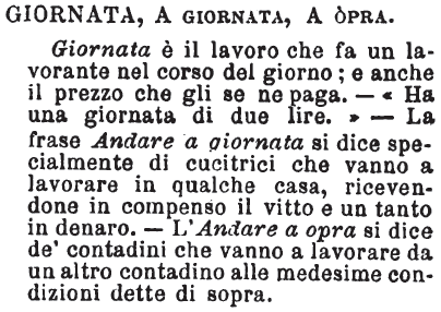 | Giornata, A giornata, A opra - Giornata è il lavoro che fa un lavorante nel corso del giorno; e anche il prezzo che gli se ne paga. - « Ha una giornata di due lire.» - La frase Andare a giornata si dice specialmente di cucitrici che vanno a lavorare in qualche casa, ricevendone in compenso il vitto e un tanto in denaro. - L'Andare a opra si dice de' contadini che vanno a lavorare da un altro contadino alle medesime condizioni dette di sopra. [immagine] |