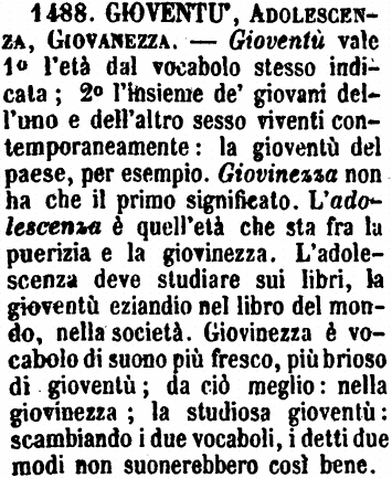 | Gioventù, Adolescenza, Giovanezza - Gioventù vale 1° l'età dal vocabolo stesso indicata; 2° l'insieme de' giovani dell'uno e dell'altro sesso viventi contemporaneamente: la gioventù del paese, per esempio. Giovinezza non ha che il primo significato. L'adolescenza è quell'età che sta fra la puerizia e la giovinezza. L'adolescenza deve studiare sui libri, la gioventù eziandio nel libro del mondo, nella società. Giovinezza è vocabolo di suono più fresco, più brioso di gioventù; da ciò meglio: nella giovinezza; la studiosa gioventù: scambiando i due vocaboli, i detti due modi non suonerebbero così bene. [immagine] |
