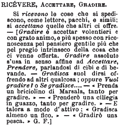 | Ricevere, Accettare, Gradire - Si ricevono le cose che si spediscono, come lettere, pacchi, e simili; si accettano quelle che altri ci offre. - [Gradire è accettar volentieri e con grato animo, e più spesso con riconoscenza pel pensiero gentile più che pel pregio intrinseco della cosa che ci venne offerta. Gradire assoluto s'usa in senso affine ad Accettare, Prendere, parlandosi di cibi e di bevande. - Gradisca suol dirsi offrendo ad altri qualcosa; oppure Vuol gradire? o Se gradisce.... - «Prenda un briciolino di Marsala, tanto per gradire.» - «Prenderò una ciliegia in guazzo, tanto per gradire.» - E talora a modo d'attivo; «Gradisca almeno un fico.» - «Gradirò una pesca.» G. F.] [immagine] |