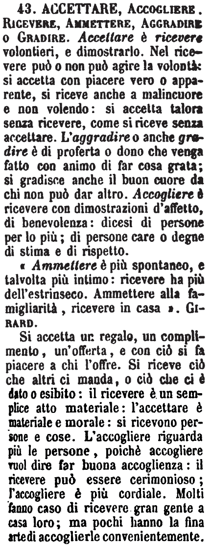 «Ammettere è più spontaneo, e talvolta più intimo: ricevere ha più dell'estrinseco. Ammettere alla famigliarità, ricevere in casa». Girard. Si accetta un regalo, un complimento, un'offerta, e con ciò si fa piacere a chi l'offre. Si riceve ciò che altri ci manda, o ciò che ci è dato o esibito: il ricevere è un semplice atto materiale: l'accettare è materiale e morale: si ricevono persone e cose. L'accogliere riguarda più le persone, poichè accogliere vuol dire far buona accoglienza: il ricevere può essere cerimonioso; l'accogliere è più cordiale. Molti fanno caso di ricevere gran gente a casa loro; ma pochi hanno la fina arte di accoglierle convenientemente. [immagine] |