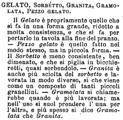 | Gelato, Sorbetto, Granita, Gramolata, Pezzo gelato - Il Gelato è propriamente quello che si fa in una forma grande, ridotto a molta consistenza, e che si fa per portarlo in tavola alla fine del pranzo. - Pezzo gelato è quello fatto nel modo stesso, ma in piccola forma. - Il Sorbetto è meno consistente, ben dimenato, e che si piglia in bicchieretti, quasi sorbendolo. - Granita è anche più sciolta del sorbetto e lavorata in modo diverso, sì che viene come un composto di tanti piccoli granellini. - Gramolata si chiamerebbe quando è più lavorata; ma nell'uso si suol prendere l'una per l'altra, e più spesso si dice Gramolata che Granita. [immagine] |
