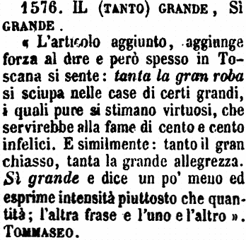 | Il (tanto) grande, Sì grande - «L'articolo aggiunto, aggiunge forza al dire e però spesso in Toscana si sente: tanta la gran roba si sciupa nelle case di certi grandi, i quali pure si stimano virtuosi, che servirebbe alla fame di cento e cento infelici. E similmente: tanto il gran chiasso, tanta la grande allegrezza. Sì grande e dice un po' meno ed esprime intensità piuttosto che quantità; l'altra frase e l'uno e l'altro». Tommaseo. [immagine] |