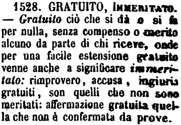 | Gratuito, Immeritato - Gratuito ciò che si dà o si fa per nulla, senza compenso o merito alcuno da parte di chi riceve, onde per una facile estensione gratuito venne anche a significare immeritato: rimprovero, accusa, ingiuria gratuiti, son quelli che non sono meritati: affermazione gratuita quella che non è confermata da prove. [immagine] |