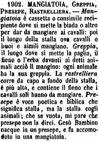 | Mangiatoia, Greppia, Presepe, Rastrelliera - Mangiatoia è cassetta o consimile recipiente dove si mette la biada o altro per dar da mangiare ai cavalli: poi il luogo della stalla ove cavalli o buoi e simili mangiano. Greppia, il luogo dove si mette la paglia, il fieno o l'erba davanti ai detti animali acciò li mangino: ogni animale ha la sua greppia. La rastrelliera corre da capo a fondo della stalla, è più alta, e contiene il fieno che i cavalli soli hanno da mangiare. Presepe è voce poetica e biblica che significa stalla, ma la stalla cogli animali; che se vuota, mi pare che presepe non la direi. Gesù Bambino nacque in un presepe, e fu accomodato in una mangiatoia. [immagine] |
