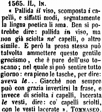 | Il, In - «Pallida il viso, scomposta i capelli, e siffatti modi, segnatamente la lingua poetica li ama. Ben si potrebbe dire: pallida in viso, ma non già sciolta ne' capelli, o altro simile. E però la prosa stessa può talvolta ammettere questo gentile grecismo, che è pure dell'uso toscano; nel quale si può sentire tutto giorno: era pieno le tasche, per dire: aveva le... Giacchè non sempre può con grazia invertirsi la frase, e invece di sciolta i capelli, lacerata le vesti, dire: co' capelli sciolti, con le vesti lacerate». Tommaseo. [immagine] |