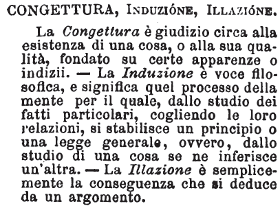 | Congettura, Induzione, Illazione - La Congettura è giudizio circa alla esistenza di una cosa, o alla sua qualità, fondato su certe apparenze o indizii. - La Induzione è voce filosofica, e significa quel processo della mente per il quale, dallo studio dei fatti particolari, cogliendo le loro relazioni, si stabilisce un principio o una legge generale, ovvero, dallo studio di una cosa se ne inferisce un'altra. - La Illazione è semplicemente la conseguenza che si deduce da un argomento. [immagine] |