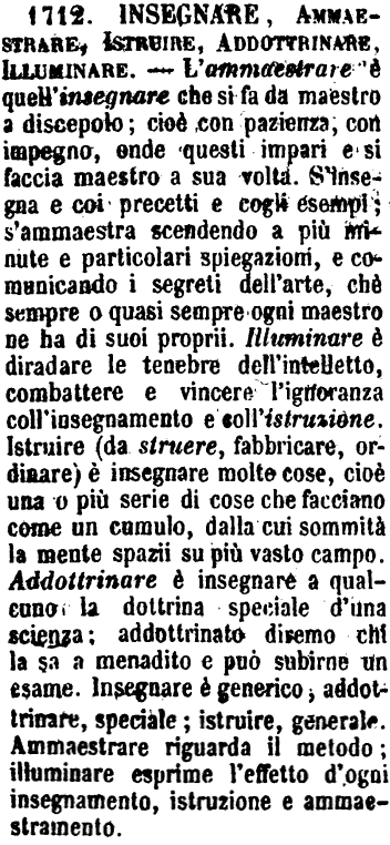| Insegnare, Ammaestrare, Istruire, Addottrinare, Illuminare - L'ammaestrare è quell'insegnare che si fa da maestro a discepolo; cioè con pazienza, con impegno, onde questi impari e si faccia maestro a sua volta. S'insegna e coi precetti e cogli esempi; s'ammaestra scendendo a più minute e particolari spiegazioni, e comunicando i segreti dell'arte, chè sempre o quasi sempre ogni maestro ne ha di suoi proprii. Illuminare è diradare le tenebre dell'intelletto, combattere e vincere l'ignoranza coll'insegnamento e coll'istruzione. Istruire (da struere, fabbricare, ordinare) è insegnare molte cose, cioè una o più serie di cose che facciano come un cumulo, dalla cui sommità la mente spazii su più vasto campo. Addottrinare è insegnare a qualcuno la dottrina speciale d'una scienza; addottrinato diremo chi la sa a menadito e può subirne un esame. Insegnare è generico, addottrinare, speciale; istruire, generale. Ammaestrare riguarda il metodo; illuminare esprime l'effetto d'ogni insegnamento, istruzione e ammaestramento. [immagine] |