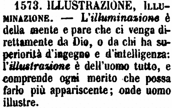 | Illustrazione, Illuminazione - L'illuminazione è della mente e pare che ci venga direttamente da Dio, o da chi ha superiorità d'ingegno e d'intelligenza: l'illustrazione è dell'uomo tutto, e comprende ogni merito che possa farlo più appariscente; onde uomo illustre. [immagine] |