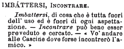 | Imbattersi, Incontrare - Imbattersi, di cosa che è tutta fuori dell'uso ed è fuori di ogni aspettazione. - Incontrare può bene esser preveduto e cercato. - « Vo' andare alle Cascine dove forse incontrerò l'amico. » [immagine] |