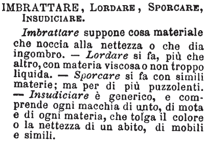 | Imbrattare, Lordare, Sporcare, Insudiciare - Imbrattare suppone cosa materiale che noccia alla nettezza o che sia ingombro. - Lordare si fa, più che altro, con materia viscosa o non troppo liquida. - Sporcare si fa con simili materie; ma per di più puzzolenti. - Insudiciare è generico, e comprende ogni macchia di unto, di mota e di ogni materia, che tolga il colore o la nettezza di un abito, di mobili e simili. [immagine] |