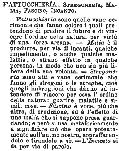 | Fattucchiera, Stregoneria, Malia, Fascino, Incanto - Fattucchieria sono quelle vane cerimonie che fanno coloro i quali pretendono di predire il futuro e di vincere l'ordine della natura, per virtù di una forza arcana. - Malía è il produrre, per via di incanti, qualche impedimento, o anche qualche malattia, o strano effetto in qualche persona, in modo che non sia più libera della sua volontà. - Stregoneria sono atti e vane cerimonie che fanno gli stregoni o le streghe, cioè quegli imbroglioni che dánno ad intendere di vincere per essa l'ordine della natura: guarire malattie e simili cose. - Fascino è voce, più che altro, di erudizione, ed è l'effetto di una malía che si suppone presa guardando; e però si usa metaforicamente a significare ciò che opera potentemente sull'animo nostro, sopraffacendolo e tirandolo a sè. - L'Incanto si fa per via di parole. [immagine] |