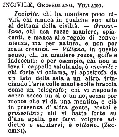 | Incivile, Grossolano, Villano - Incivile, chi ha maniere poco civili, chi manca in qualche suo atto ai dettami della civiltà. - Grossolano, chi usa rozze maniere, spiacenti, e manca alle regole di convenienza, ma per natura, e non per mala creanza. - Villano, in questo senso, chi ha maniere rozze, goffe e indecenti; e per esempio, chi non si leva il cappello salutando, è incivile; chi forte chiama, vi apostrofa da un lato della sala a un altro, trinciando l'aria colle mani e colle braccia come un telegrafo; chi vi risponde secco secco un sì o un no, senza por mente che vi dà una mentita, e ciò in presenza d'altra gente, costui è grossolano; chi vi batte forte su d'una spalla per farvi volgere addietro e salutarvi, è villano. (Zecchini). [immagine] |