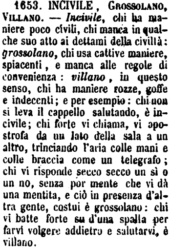 | Incivile, Grossolano, Villano - Incivile, chi ha maniere poco civili, chi manca in qualche suo atto ai dettami della civiltà: grossolano, chi usa cattive maniere, spiacenti, e manca alle regole di convenienza: villano, in questo senso, chi ha maniere rozze, goffe e indecenti; e per esempio: chi non si leva il cappello salutando, è incivile; chi forte vi chiama, vi apostrofa da un lato della sala a un altro, trinciando l'aria colle mani e colle braccia come un telegrafo; chi vi risponde secco secco un sì o un no, senza por mente che vi dà una mentita, e ciò in presenza d'altra gente, costui è grossolano: chi vi batte forte su d'una spalla per farvi volgere addietro e salutarvi, è villano. [immagine] |