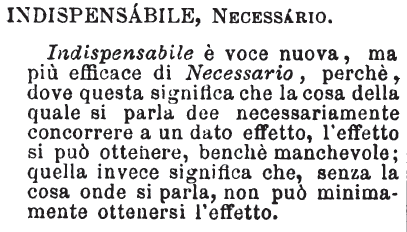 | Indispensabile, Necessario - Indispensabile è voce nuova, ma più efficace di Necessario, perchè, dove questa significa che la cosa della quale si parla dee necessariamente concorrere a un dato effetto, l'effetto si può ottenere, benchè manchevole; quella invece significa che, senza la cosa onde si parla, non può minimamente ottenersi l'effetto. [immagine] |