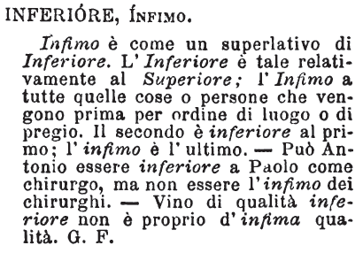 Inferiore, Infimo - Infimo è come un superlativo di Inferiore. L'Inferiore è tale relativamente al Superiore; l'Infimo a tutte quelle cose o persone che vengono prima per ordine di luogo o di pregio. Il secondo è inferiore al primo; l'infimo è l'ultimo. - Può Antonio essere inferiore a Paolo come chirurgo, ma non essere l'infimo dei chirurghi. - Vino di qualità inferiore non è proprio d'infima qualità. G. F. [immagine]