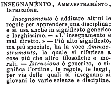 | Insegnamento, Ammaestramento, Istruzione - Isegnamento è additare altrui le regole per apprendere una disciplina; e si usa anche in significato generico e larghissimo. - «L'insegnamento è mal diretto.» - Più alto significato, ma più speciale, ha la voce Ammaestramento, la quale si riferisce a cose più che altro filosofiche e morali. - Istruzione è generico, e significa l'ordine, le regole, le leggi, per via delle quali si insegnano ai giovani le varie scienze e discipline. [immagine] |