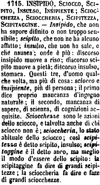 | Insipido, Sciocco, Scipito, Insulso, Insipiente; Sciocchezza, Scioccheria, Scipitezza, Scipitaggine - Insipido, che non ha sapore difinito o non troppo sensibile; scipito, che non ne ha alcuno affatto; insulso, che non ha sale, e che nausea; onde è più: discorso insipido muove a riso; discorso scipito muove a pietà; discorso insulso, stomaca. Questi tre, d'uomo qualche volta, ma più di cosa: sciocco e insipiente, più di persona; il primo dice proprio mancanza d'ingegno naturale; il secondo, mancanza di sapere, di scienza, di cognizioni acquisite. Sciocchezze sono le azioni dello sciocco, e talvolta anche di chi sciocco non è; scioccheria, lo stato abituale dello sciocco; così scipitezza è detto scipito, insulso; scipitaggine è il detto anco, ma meglio il modo d'essere dello scipito: la scipitaggine fa dire di grandi scipitezze; la scioccheria fa dire e fare di grandi sciocchezze. [immagine] |