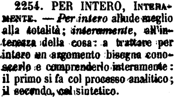 | Per intero, Interamente - Per intero allude meglio alla totalità; interamente, all'interezza della cosa: a trattare per intero su un argomento bisogna conoscerlo e comprenderlo interamente: il primo si fa col processo analitico; il secondo, col sintetico. [immagine] |