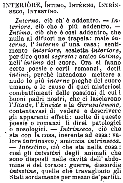 | Interiore, Intimo, Interno, Intrinseco, Intestino - Interno, ciò ch'è addentro; interiore, ciò che è più addentro; intimo, ciò ch'è così addentro, che nulla al difuori ne trapela: male interno, l'interno d'una casa; sentimento interiore, scaletta interiore per dire quasi segreta; amico intimo, nell'intimo del cuore: ora si fanno certe poesie e certi romanzi, detti intimi, perchè intendono mettere a nudo le più interne pieghe del cuore umano, e le cause di quei misteriosi combattimenti delle passioni di cui i buoni padri nostri, che ci lasciarono l'Iliade, l'Eneide e la Gerusalemme, contentavansi di vedere e descrivere gli apparenti effetti: molte di queste poesie o romanzi li direi patologici o nosologici. Intrinseco, ciò che sta con la cosa, inerente ad essa; valore intrinseco; amicizia intrinseca: intestino, ciò che sta nella cosa: così gl'intestini degli animali che sono disposti nelle cavità dell'abdomine e del torace: guerre, discordie intestine, quelle che travagliano gli Stati sordamente per mezzo de' partiti. [immagine] |