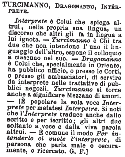 | Turcimanno, Dragomanno, Interprete - Interprete è Colui che spiega altrui, nella propria sua lingua, un discorso che altri gli fa in lingua a lui ignota. - Turcimanno è Chi tra due che non intendono l'uno il linguaggio dell'altro, espone il colloquio a ciascuno nel suo. - Dragomanno è Colui che, specialmente in Oriente, ha pubblico ufficio, o presso le Corti, o presso gli ambasciatori, di servire da interprete nelle trattative di pubblici negozii. Turcimanno si torce anche a significare Mezzano di amori. - [E' popolare la sola voce Interprete per metatesi Interpetre. Si noti che l'Interprete traduce anche dallo scritto e per iscritto; gli altri due soltanto a voce e dalla viva parola altrui. - E' comune il modo Per intenderlo ci vuole l'interprete, di persona che parla male o oscuramente, o ricercato. G. F.] [immagine] |
