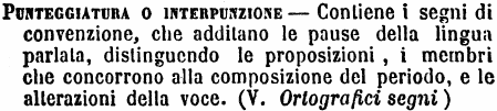 | Punteggiatura o interpunzione - Contiene i segni di convenzione, che additano le pause della lingua parlata, distinguendo le proposizioni, i menbri che concorrono alla composizione del periodo, e le alterazioni della voce. (V. Ortografici segni) [immagine] |