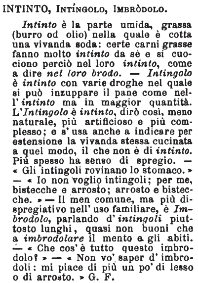 | Intinto, Intingolo, Imbrodolo - Intinto è la parte umida, grassa (burro od olio) nella quale è cotta una vivanda soda: certe carni grasse fanno molto intinto da sè e si cuociono perciò nel loro intinto, come a dire nel loro brodo. - Intingolo è intinto con varie droghe nel quale si può inzuppare il pane come nell'intinto ma in maggior quantità. L'Intingolo è intinto, dirò così, meno naturale, più artificioso e più complesso; e s'usa anche a indicare per estensione la vivanda stessa cucinata a quel modo, il che non è di intinto. Più spesso ha senso di spregio. - «Gli intingoli rovinano lo stomaco.» - «Io non voglio intingoli; per me, bistecche e arrosto; arrosto e bistecche.» - Il men comune, ma più dispregiativo nell'uso familiare, è Imbrodolo, parlando d'intingoli piuttosto lunghi, quasi non buoni che a imbrodolare il mento e gli abiti. - «Che cos'è tutto questo imbrodolo?» - «Non vo' saper d'imbrodoli: mi piace di più un po' di lesso o di arrosto.» G. F. [immagine] |