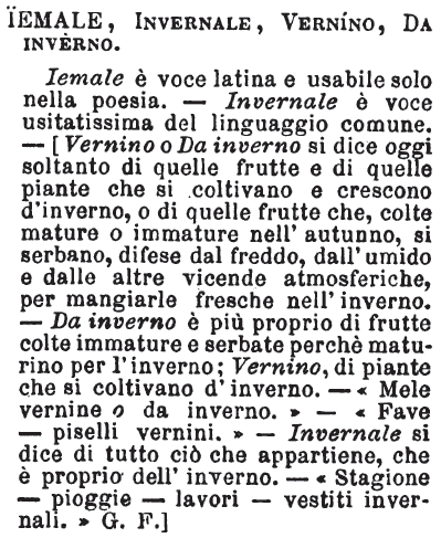 | Iemale, Invernale, Vernino, Da inverno - Iemale è voce latina e usabile solo nella poesia. - Invernale è voce usitatissima del linguaggio comune. - [Vernino o Da inverno si dice oggi soltanto di quelle frutte e di quelle piante che si coltivano e crescono d'inverno, o di quelle frutte che, colte mature o immature nell'autunno, si serbano, difese dal freddo, dall'umido e dalle altre vicende atmosferiche, per mangiarle fresche nell'inverno. - Da inverno è più proprio di frutte colte immature e serbate perchè maturino per l'inverno; Vernino, di piante che si coltivano d'inverno. - «Mele vernine o da inverno.» - «Fave - piselli vernini.» - Invernale si dice di tutto ciò che appartiene, che è proprio dell'inverno. - «Stagione - pioggie - lavori - vestiti invernali.» G. F.] [immagine] |