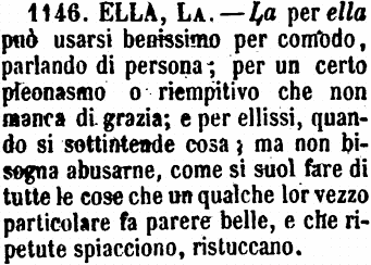 | Ella, La - La per ella può usarsi benissimo per comodo, parlando di persona; per un certo pleonasmo o riempitivo che non manca di grazia; e per ellissi, quando si sottintende cosa; ma non bisogna abusarne, come si suol fare di tutte le cose che un qualche lor vezzo particolare fa parere belle, e che ripetute spiacciono, ristuccano. [immagine] |