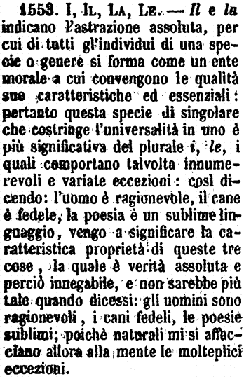 | I, Il, La, Le - Il e la indicano l'astrazione assoluta, per cui di tutti gl'individui di una specie o genere si forma come un ente morale a cui convengono le qualità sue caratteristiche ed essenziali: pertanto questa specie di singolare che costringe l'universalità in uno è più significativa del plurale i, le, i quali comportano talvolta innumerevoli e variate eccezioni: così dicendo: l'uomo è ragionevole, il cane è fedele, la poesia è un sublime linguaggio, vengo a significare la caratteristica proprietà di queste tre cose, la quale è verità assoluta e perciò innegabile, e non sarebbe più tale quando dicessi: gli uomini sono ragionevoli, i cani fedeli, le poesie sublimi; poichè naturali mi si affacciano allora alla mente le molteplici eccezioni. [immagine] |